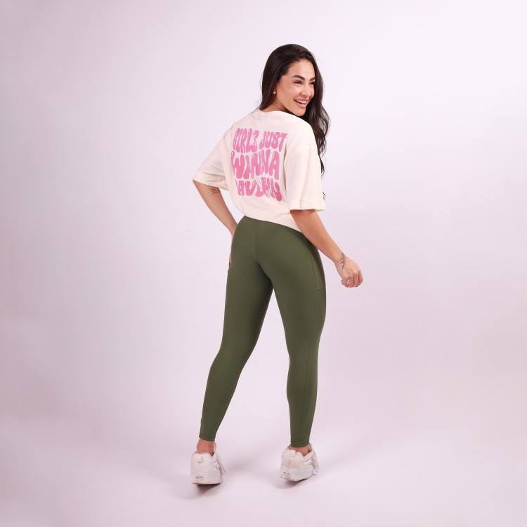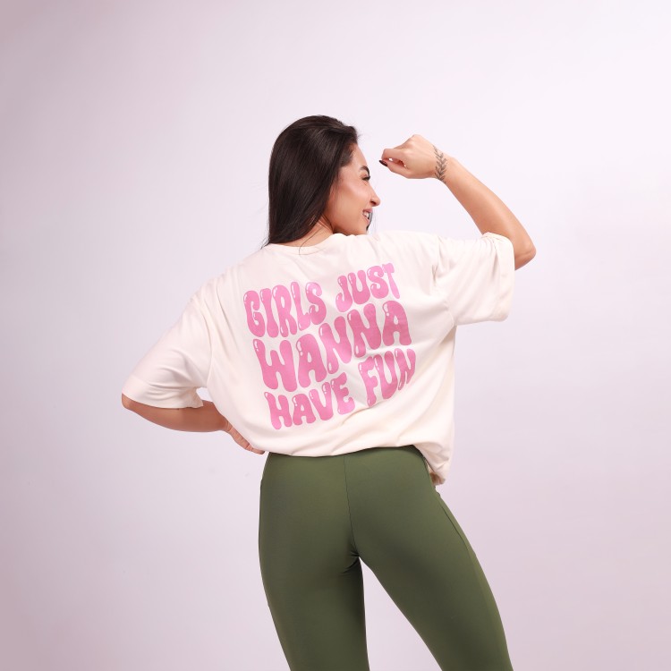 Nas costas, um silk grandão escrito "girls just wanna have fun" em rosa chá, trazendo um toque feminino na medida certa, perfeita para mulheres que querem se divertir!