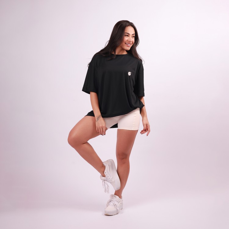 Feita em um tecido leve tipo malha, essa t-shirt é preta e tem um toque macio que é uma delícia na pele.