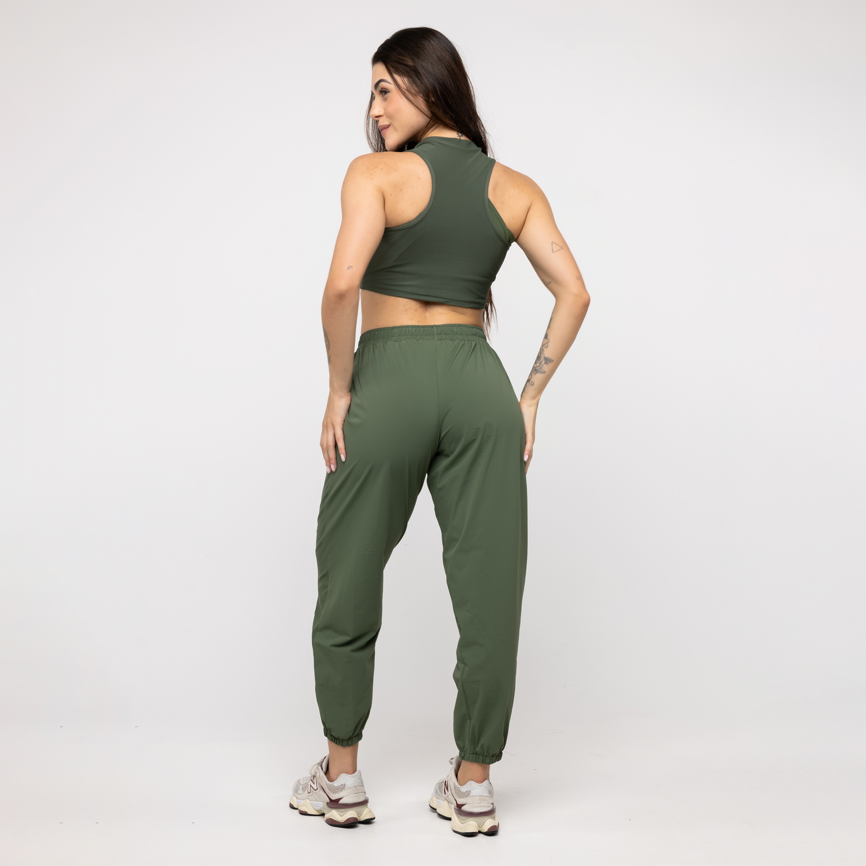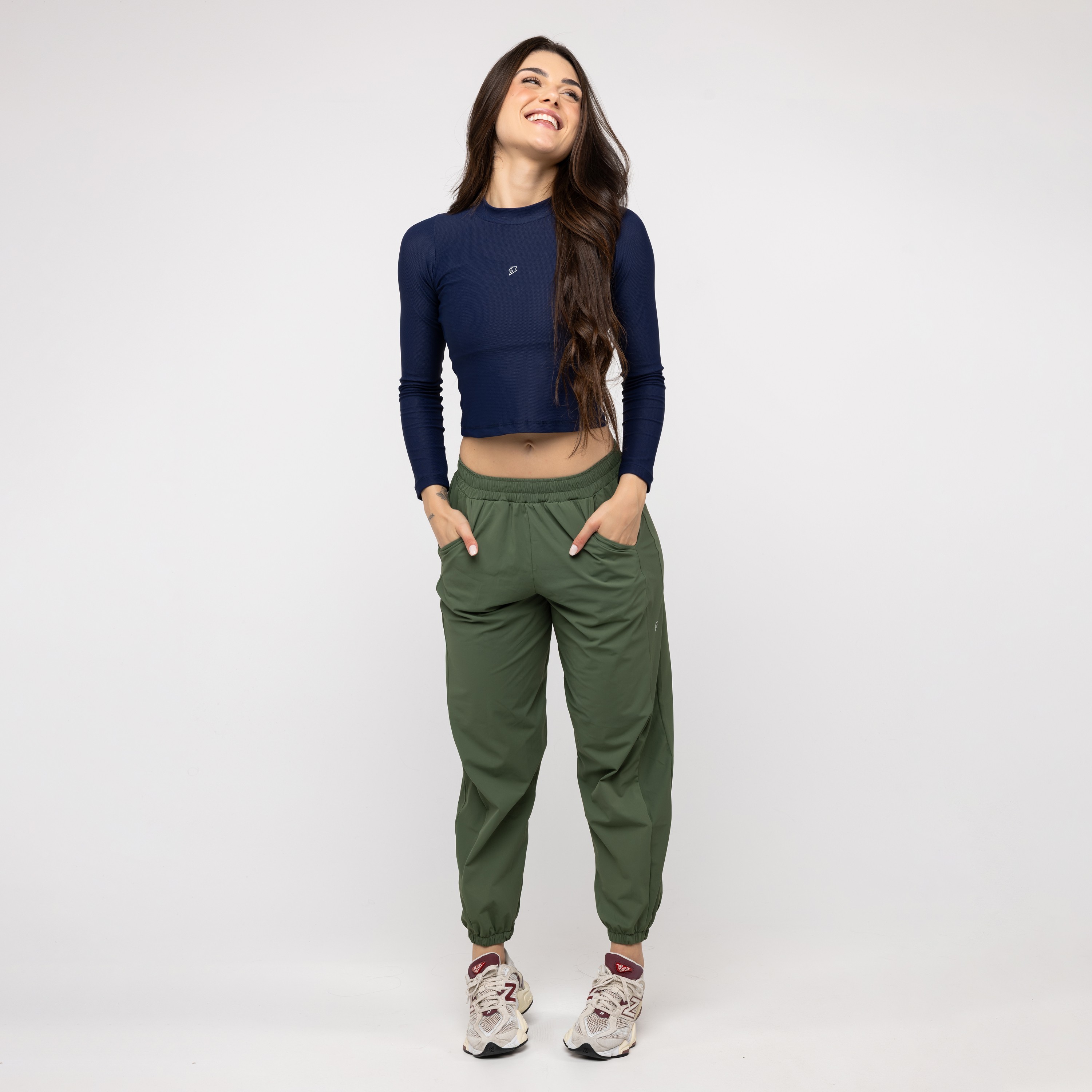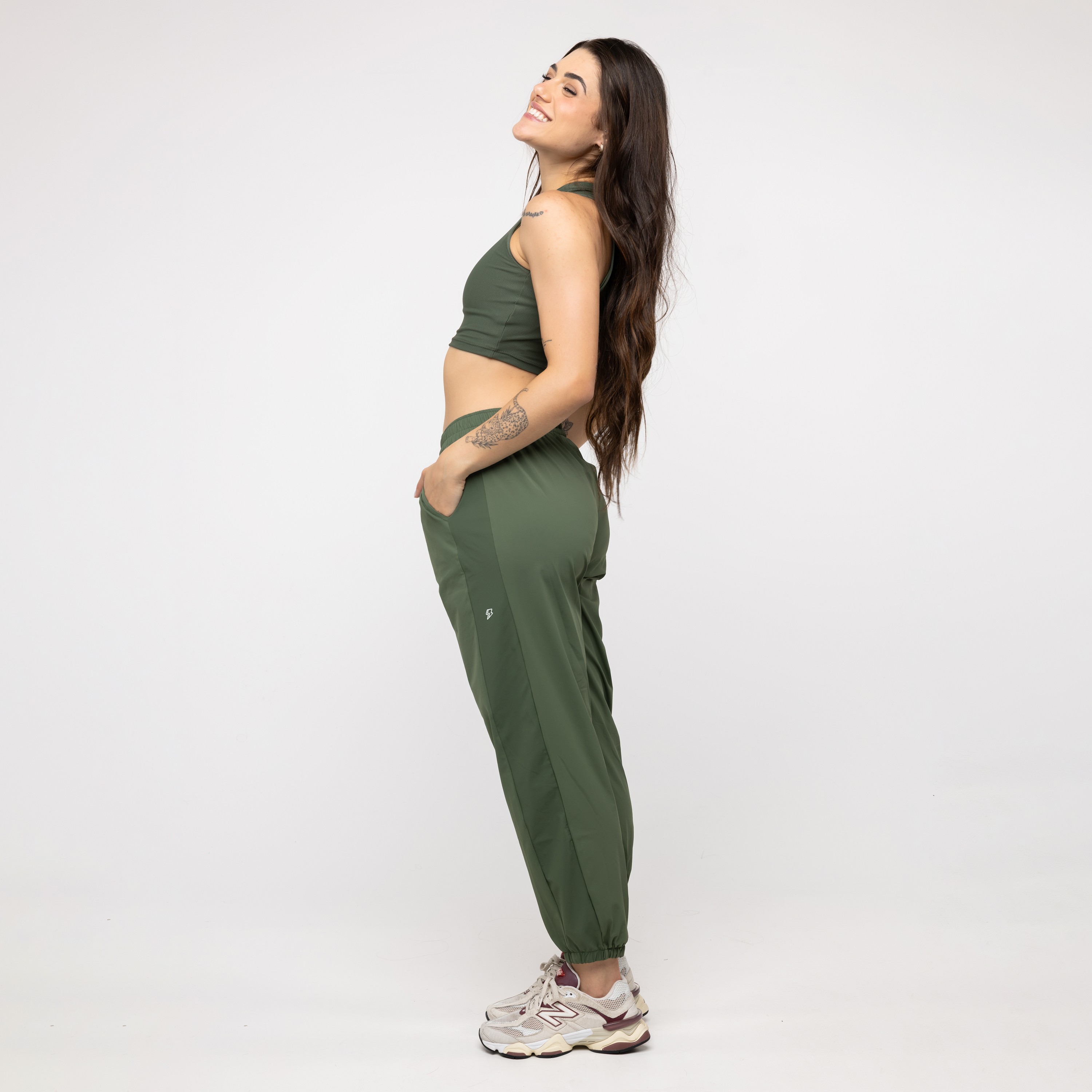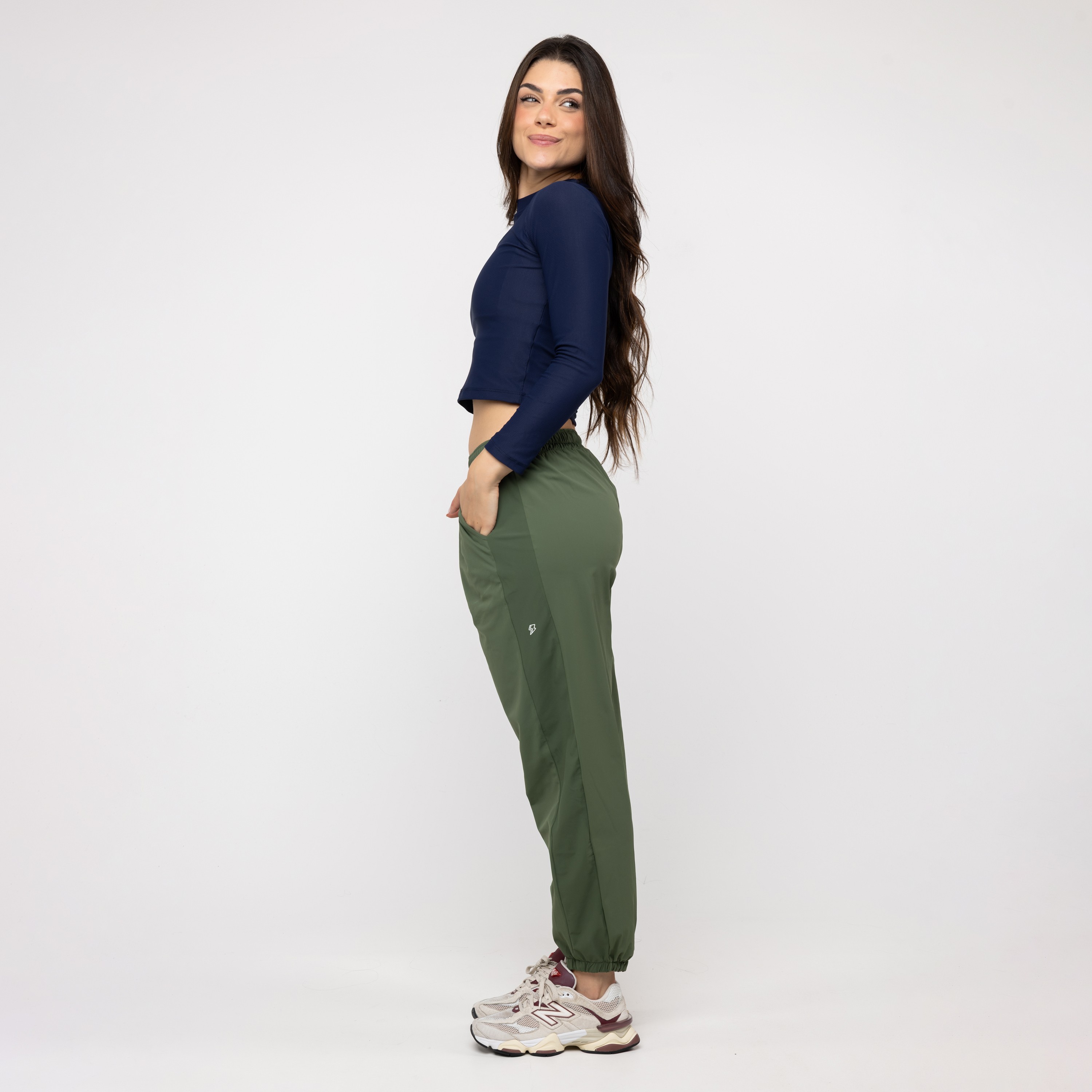 A Calça Jogger Bolso Tech Fit é super prática, com bolsos funcionais e um elástico na barra, permitindo que você use a calça presa na canela ou solta, conforme sua preferência.