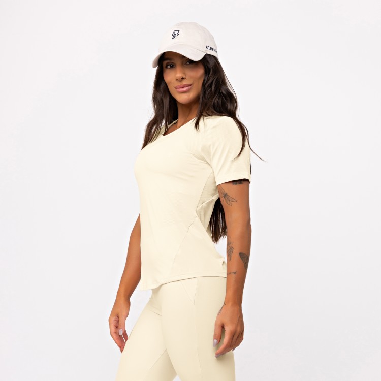 O tecido texturizado aparece como base da peça. Ele é leve, respirável e tem toque macio, garantindo um caimento solto e confortável no corpo. A elasticidade acompanha os movimentos sem pesar e deixa a blusa perfeita pro dia a dia.
